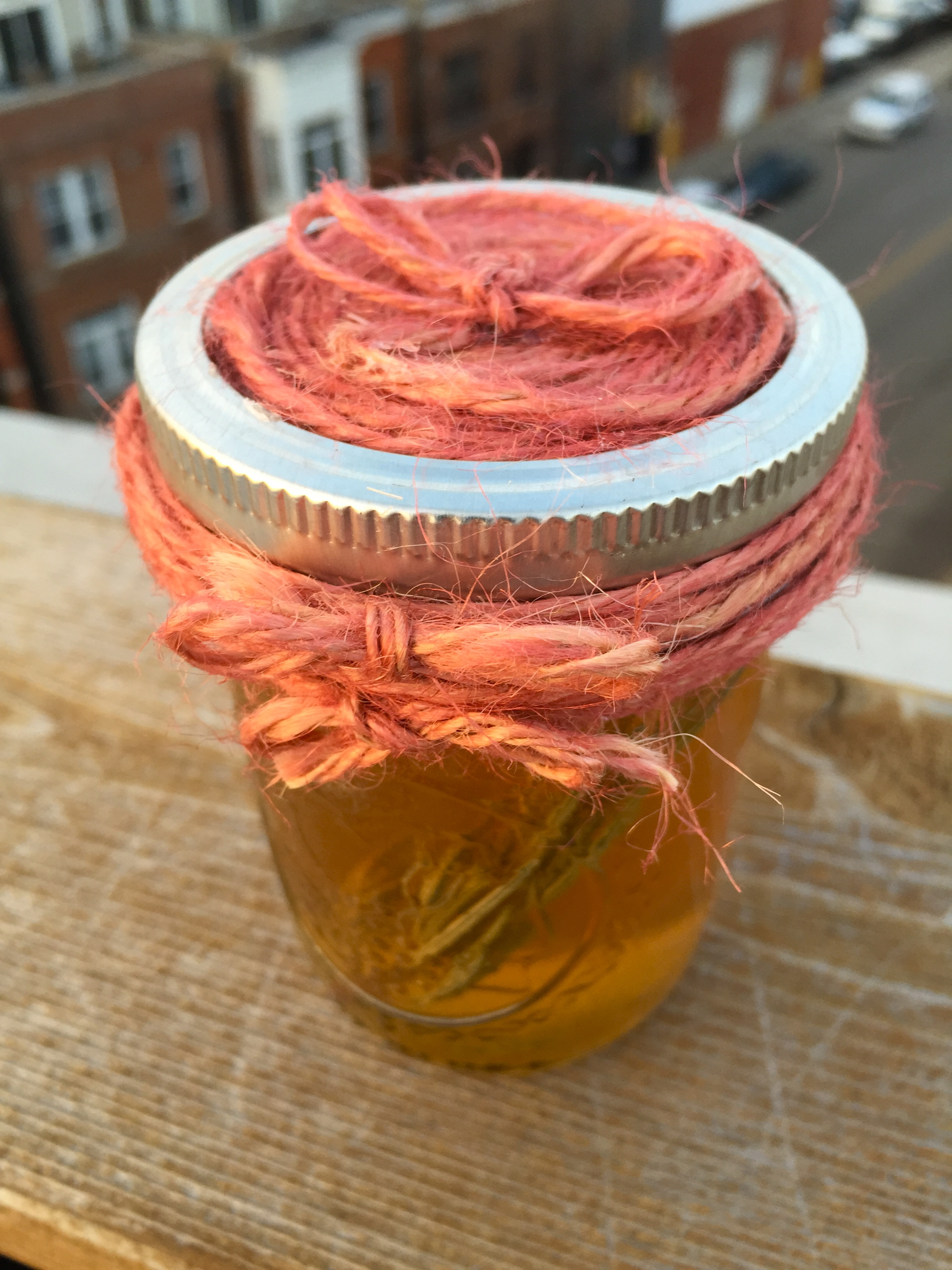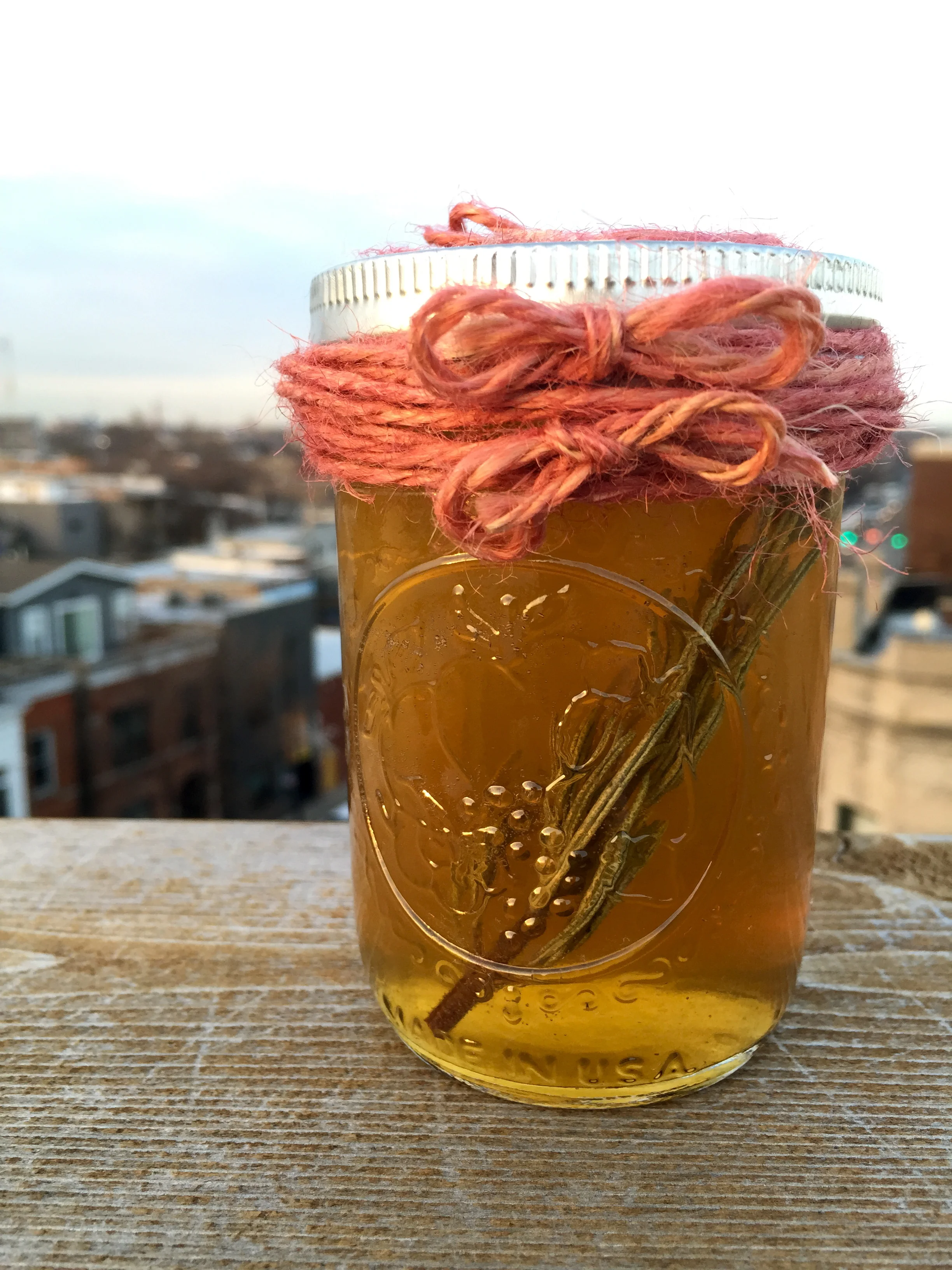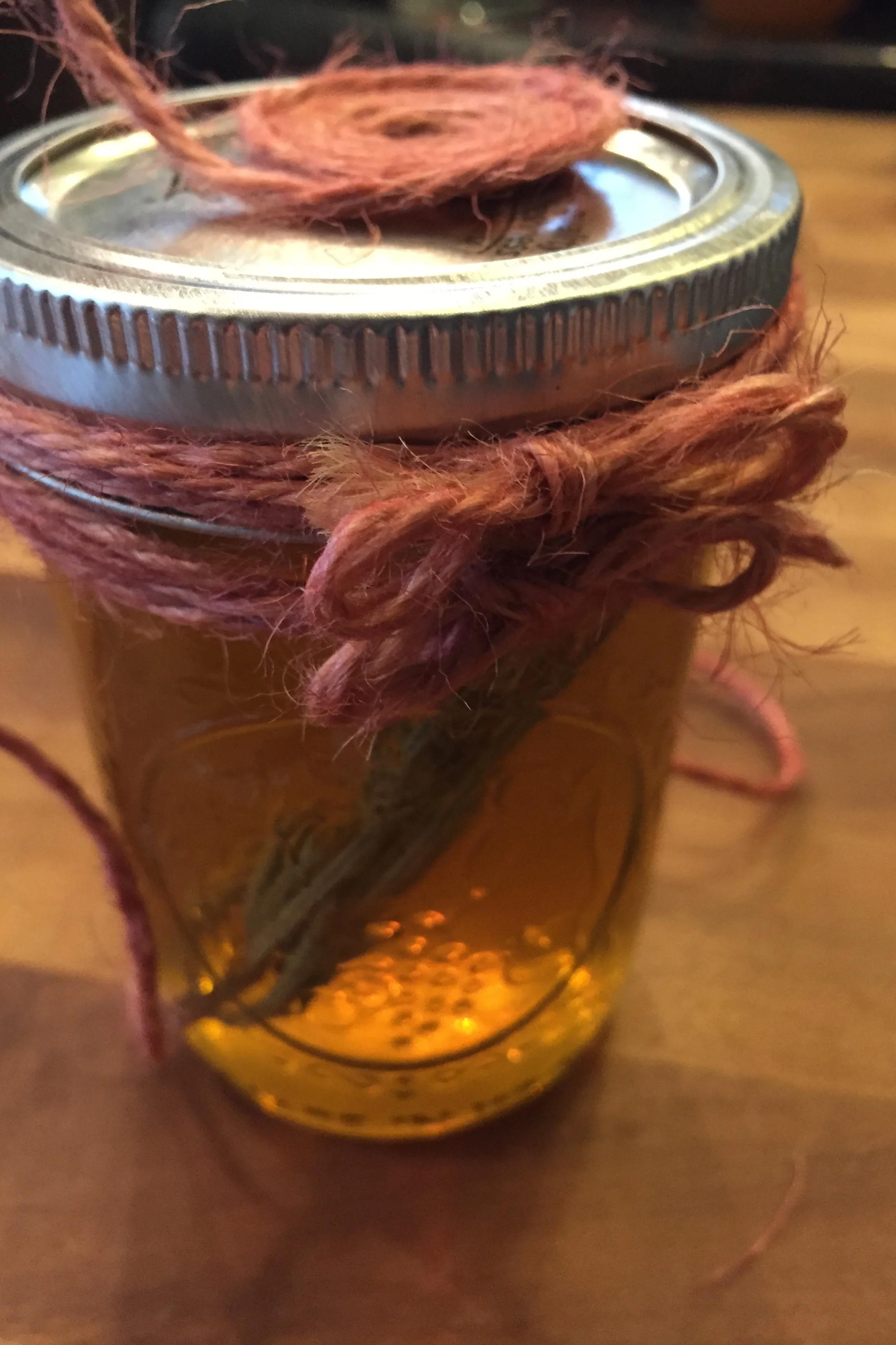 Make it pretty: Suspend a sprig of rosemary inside the Ball Jar (just be aware that the rosemary will infuse more, intensifying the taste). Use twine to wrap around where the bottom of the metal lid and the top of the glass bottle meet. Tie simple short bows (I tied two on top of each other), and call it a day.