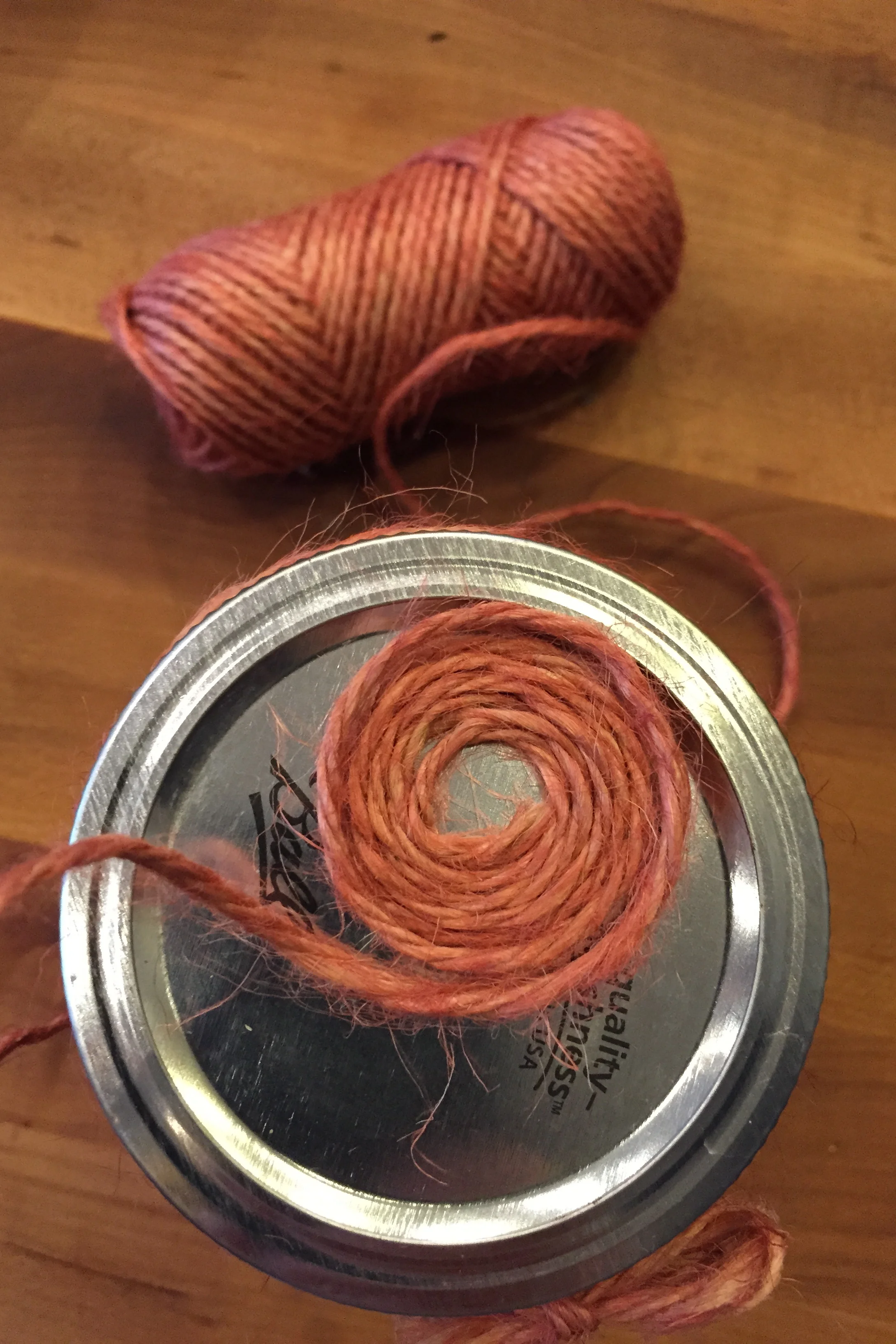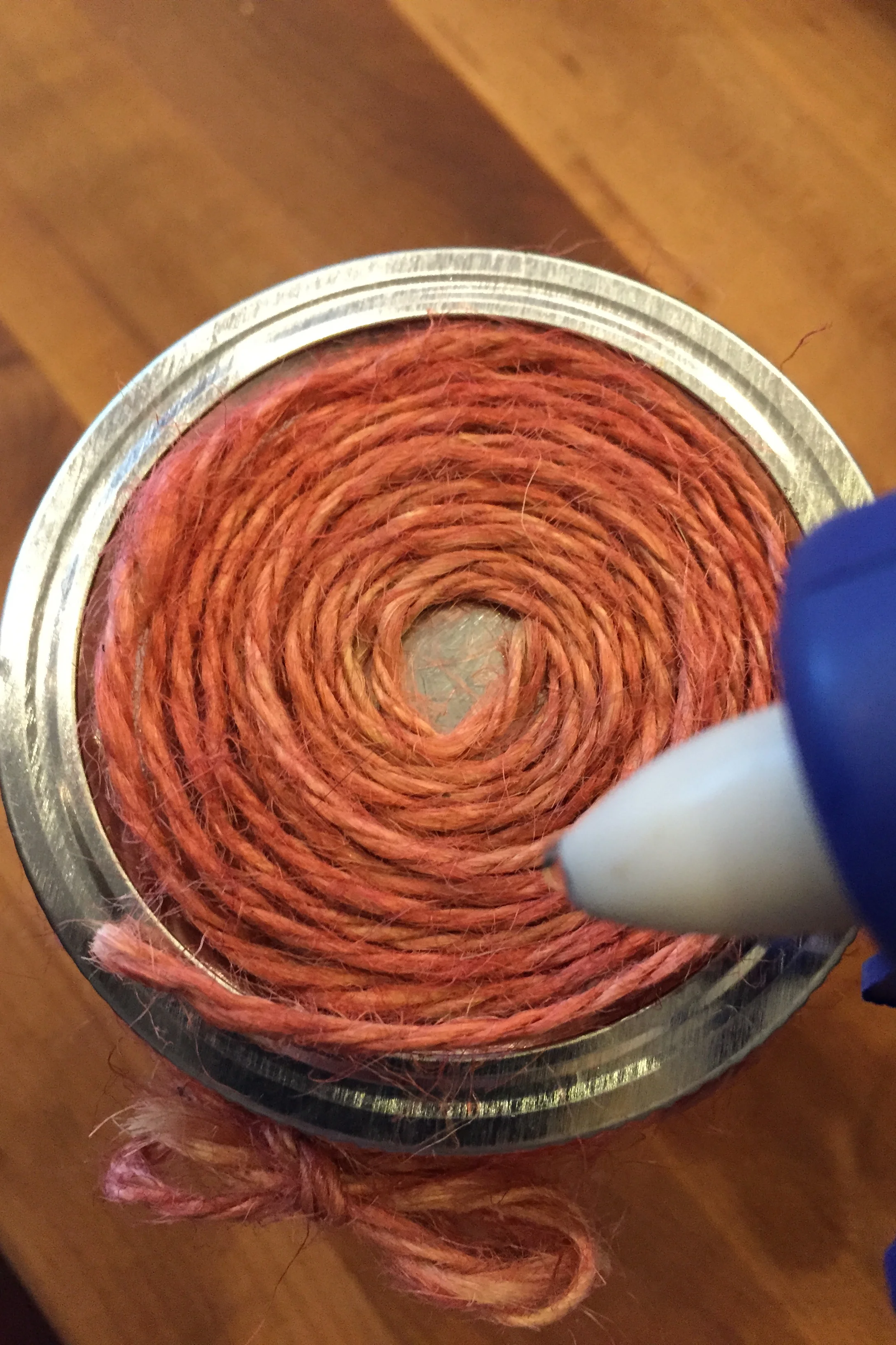 1. Spiral the twine. Leave space in the middle and don't use glue yet. Just spiral and secure with your fingers until you cover the whole lid.
