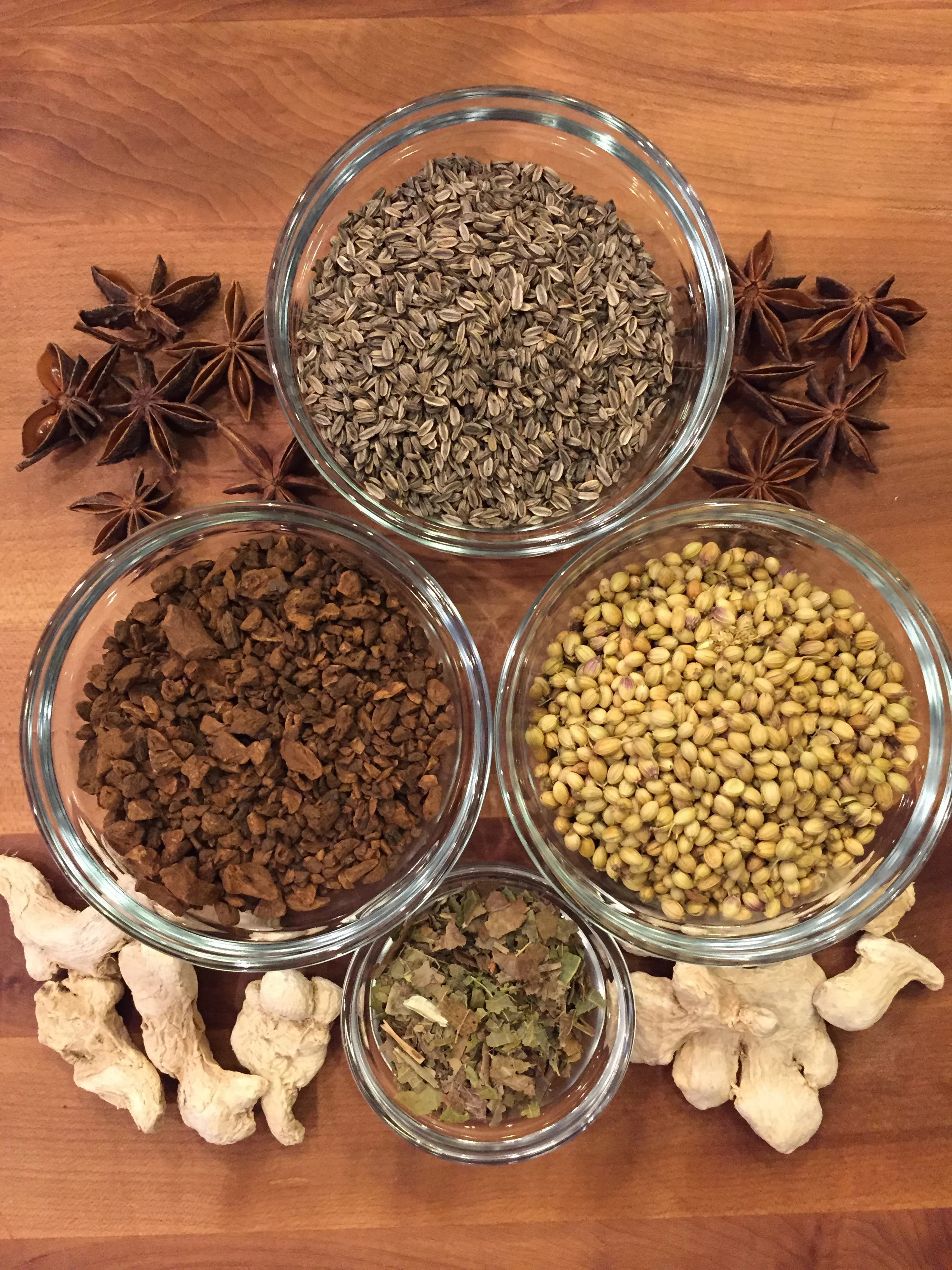 Almost all of the above can be sourced locally. In the bowls, from top, clockwise: black fennel seed, coriander seed, black walnut leaves, and chicory root. On the board, from top, star anise and dehydrated ginger.