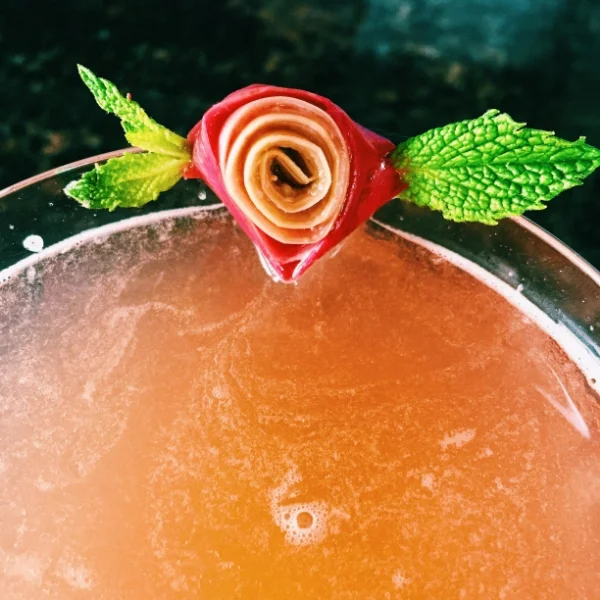 If you have trouble finagling the mint leaves, you can always tuck two leaves under the rose once you affix it to the side of your glass (see below). The cocktail below has the rose facing inwards toward the drinker, rather than straight up, which allows Mom to gaze lovingly at your rose every time she takes a sip!